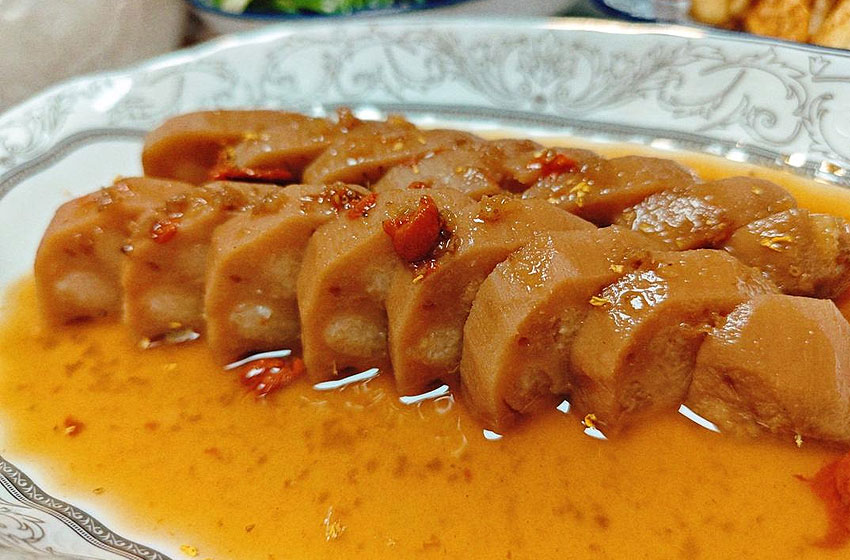 白白胖胖的莲藕被糯米塞得鼓鼓的,经过时间的熬煮,一出锅就变成了羞涩的红,锅里咕嘟咕嘟地冒着热气。切成厚片再整整齐齐地码上盘子里,淋