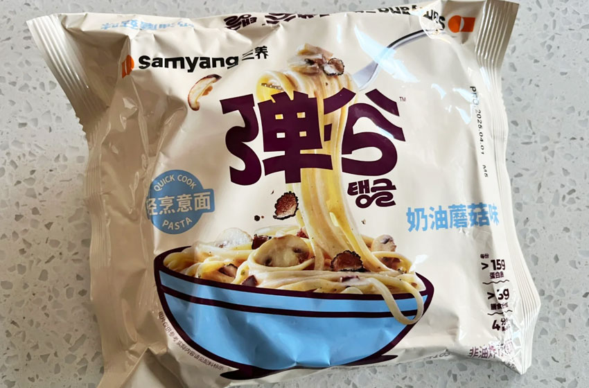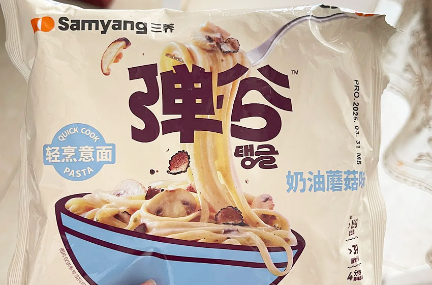 尝试了一款全新口味的三养弹谷意面,奶油烤肉味。煮制过程中,香气扑鼻,与三养奶油火鸡面颇为相似。撒上粉包后,味道几乎一模一样,让人回