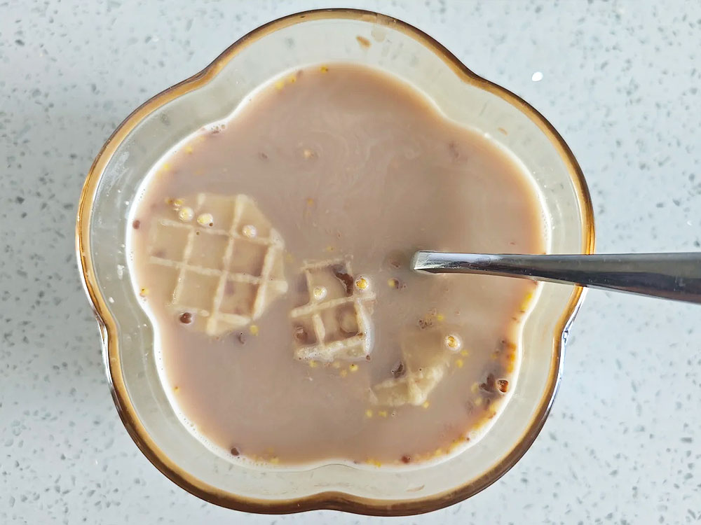 回归季奶茶,奶源源自内蒙古黄金牧场,加入内蒙古砖茶,搭配酥脆的烤奶皮和炒米,炒米经过轻度烘烤,增添脆香口感;烤奶皮则富含乳脂,带来浓郁奶香。其奶味浓郁而且配料干净,没有添加剂,奶皮子,炒米都特别足,是口味纯正的草原奶茶。