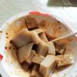 沟门前碗团选用优质荞麦,经过选料、和面、蒸熬、搅拧等步骤,采用国际上通用的真空包装和热灌装挤压工艺,隔绝空气,高温二次灭菌工艺生产而成。碗团调料以辣酱为主,配以适量的陈醋、蒜泥。辣酱的制作多选用香而微辣的品种,经研磨、油煎、配酱诸种工序制作而成,食用味道极佳。