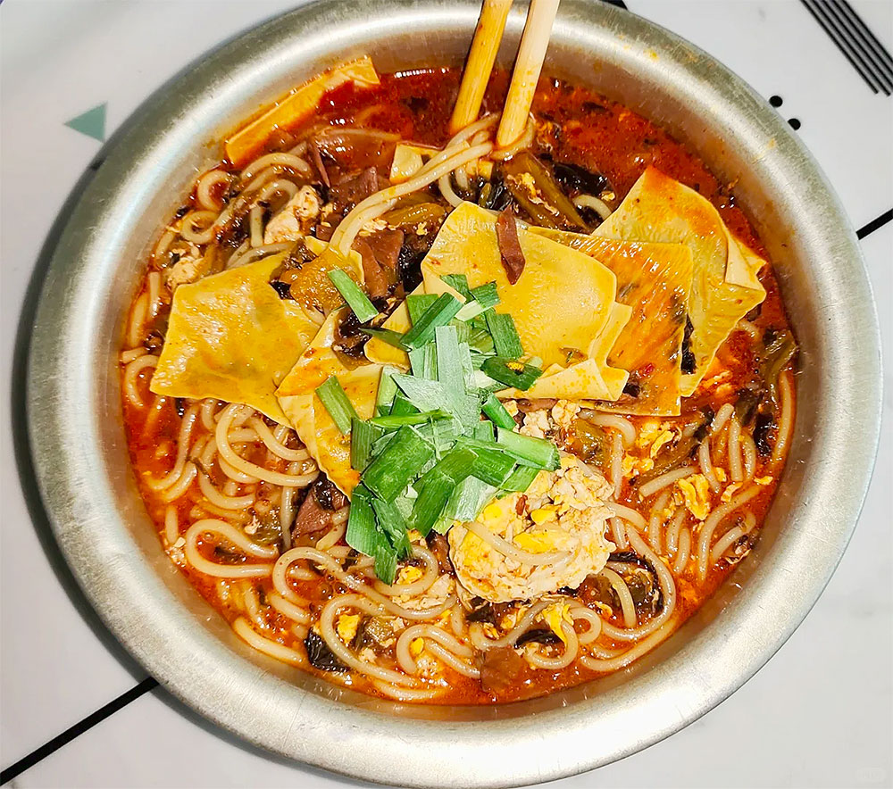 满小饱肥汁配料丰富,肉酱卤香浓郁,分量十足;米线Q弹爽滑、富有嚼劲;汤底是整碗米线的灵魂,采用猪筒骨、老母鸡等慢熬数小时,形成金黄透亮、浓稠到不见碗底的“肥汁”。其酸味来自港式发酵醋汁,带有自然果香,不刺喉;辣味则源自黄灯笼辣椒酱,鲜辣有后劲但不烧心,汤头既刺激又不腻口,酸辣鲜香在口中层层迸发。