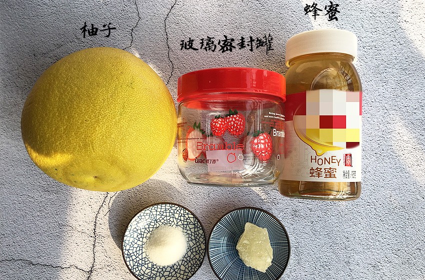材料:柚子1个(约2斤)、蜂蜜约350g、盐3勺、黄冰糖约170g、玻璃密封罐1个(1L)、清水1.5L