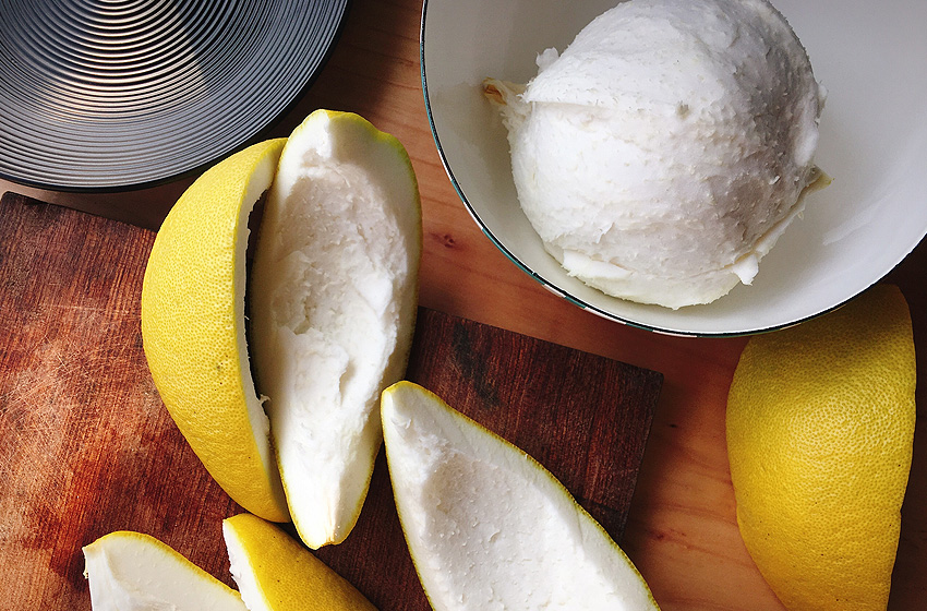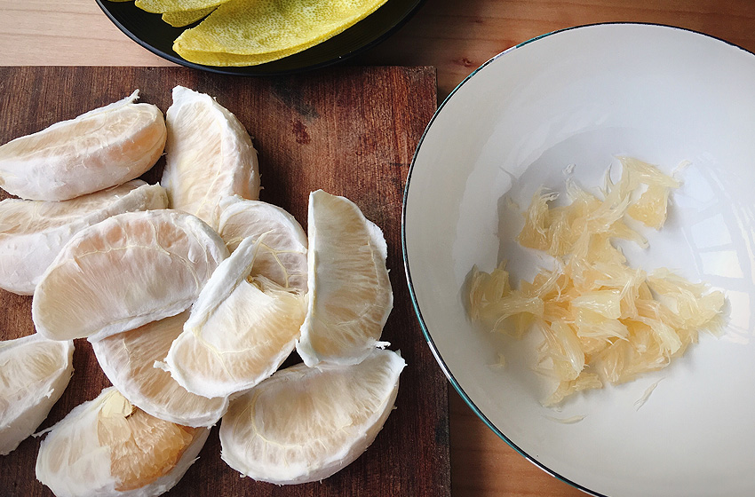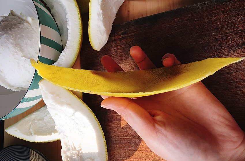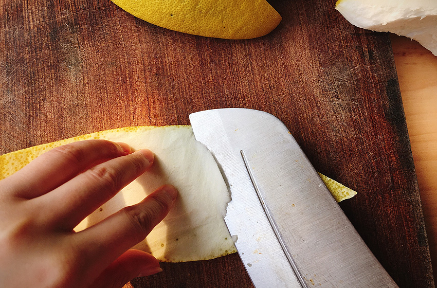 去掉白瓤,越干净越好,如果白瓤不去除,柚子茶会很苦。