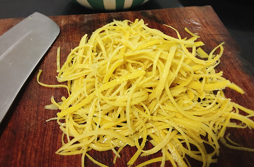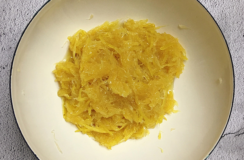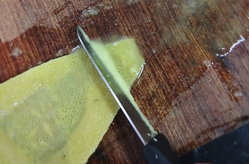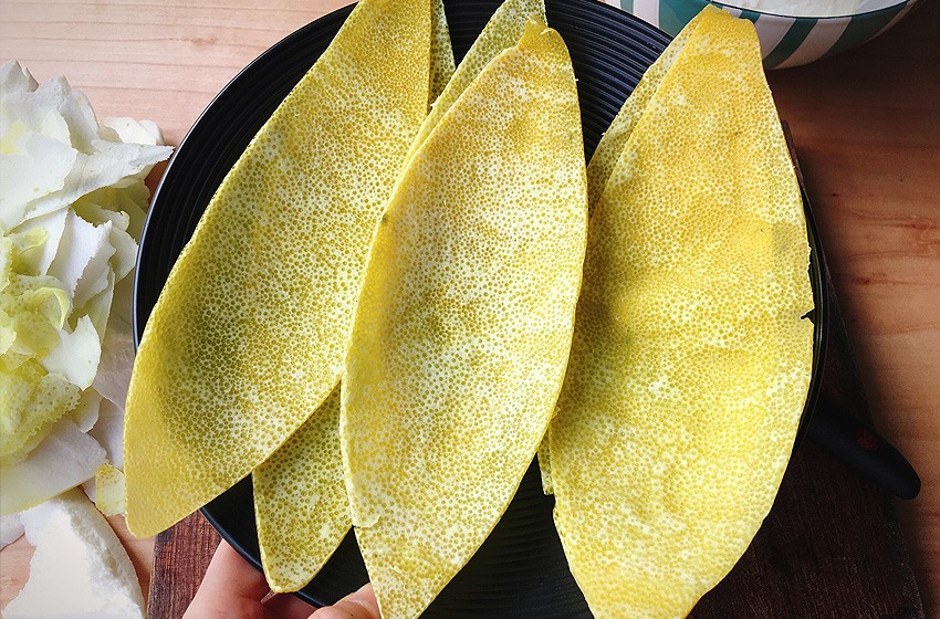 用刀轻轻刮去多余白瓤。