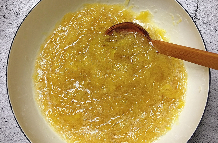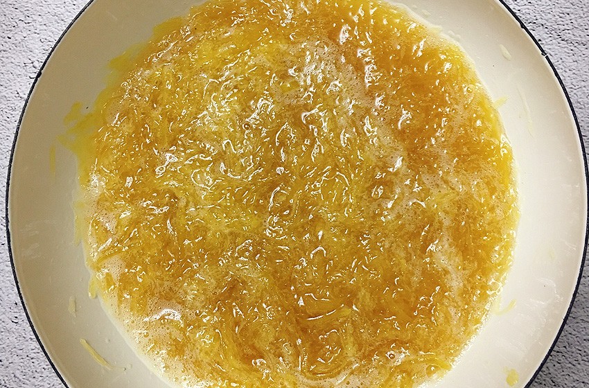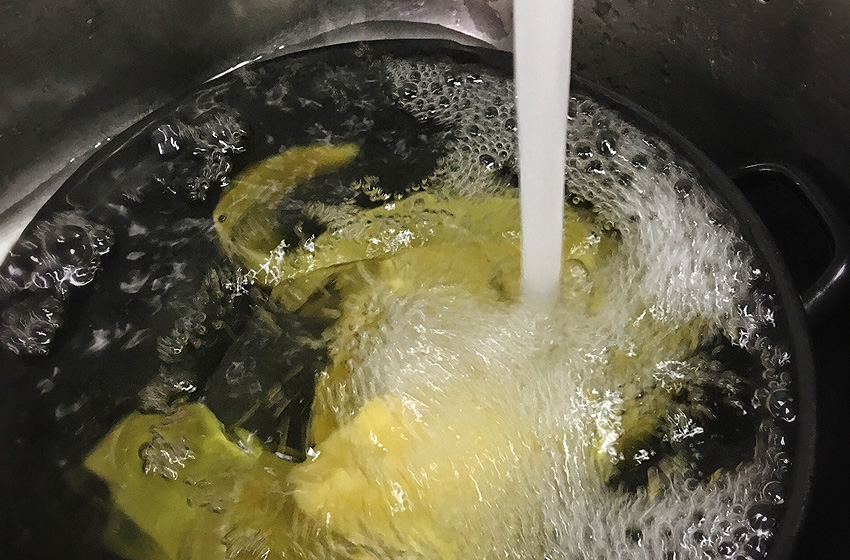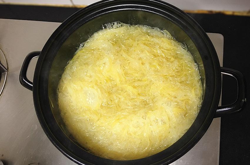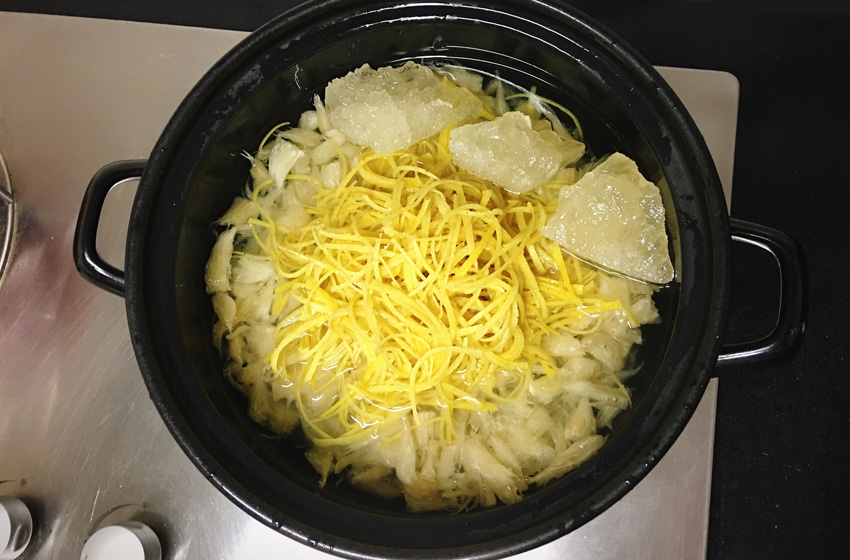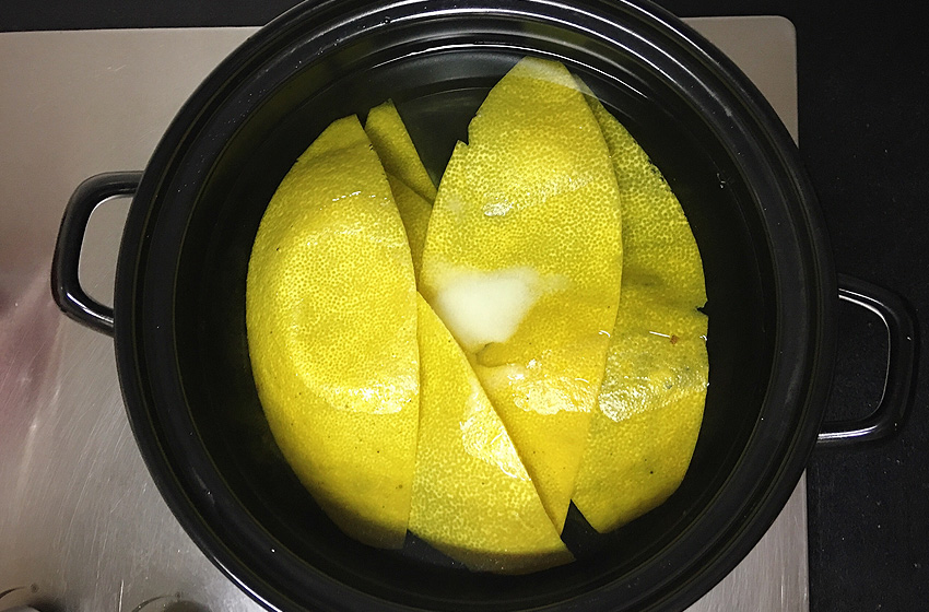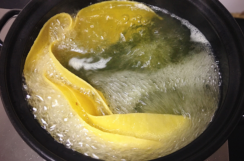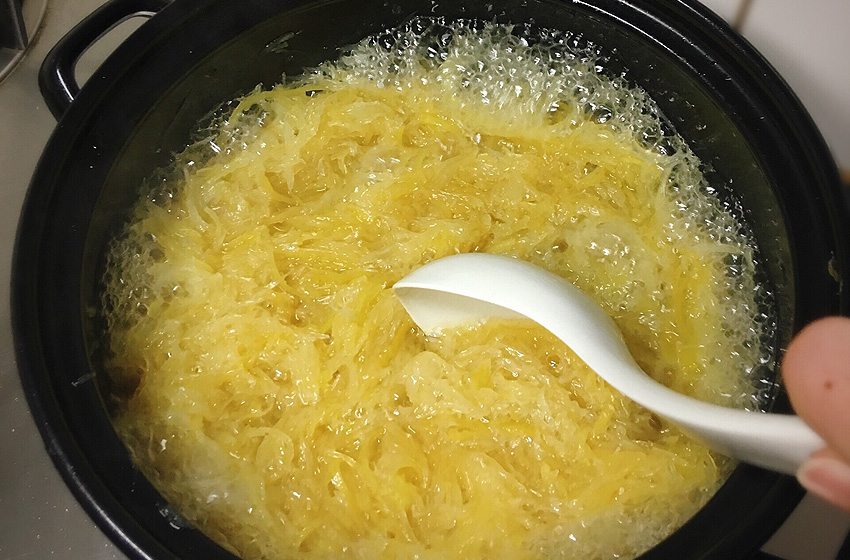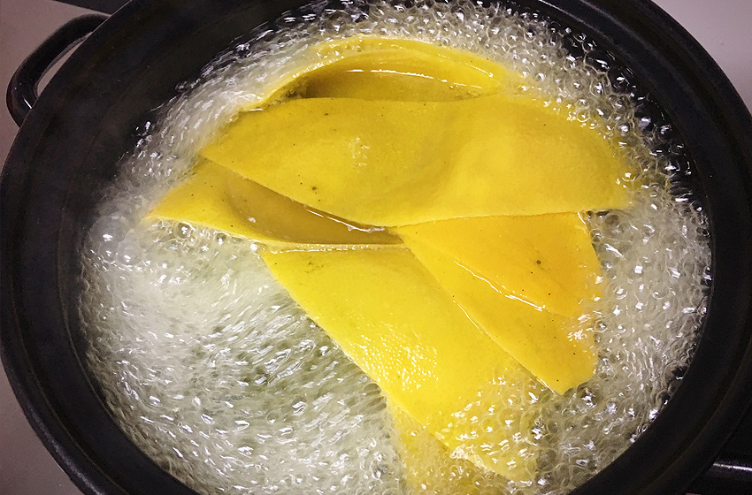 柚子皮用盐水大火煮5分钟,进一步去除苦味。