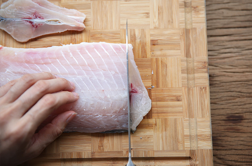 草鱼鱼肉洗干净,摸一下有没有鱼刺,有的话用镊子夹出。垂直成厚薄均匀的鱼片,一般第一刀切至鱼皮处不切断(鱼肉较小的话可以斜切,显大)。