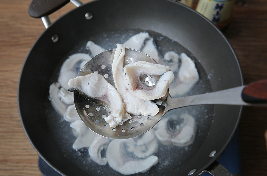 鱼片浮起快速捞起,鱼片沥干放入盘中。