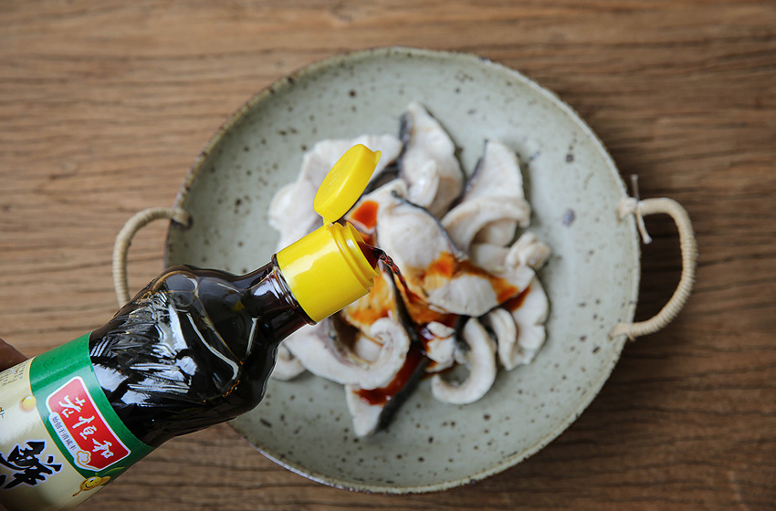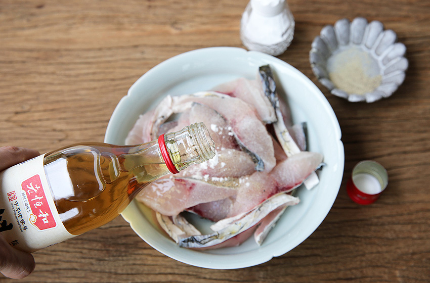 鱼片加入盐、白胡椒、生粉,倒入老恒和零添加料酒拌匀,腌制10分钟。