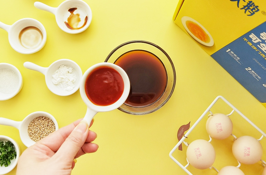用料:黄天鹅鸡蛋5个、生抽2勺、香醋2勺、番茄酱2勺、蚝油1勺、淀粉1勺、白糖1茶匙、熟白芝麻少许、香葱少许、清水半碗(小碗)
