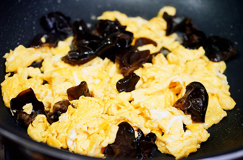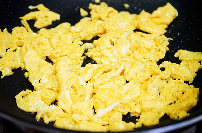 炒锅内放入适量食用油,烧热后倒入鸡蛋液,稍微凝固后迅速滑散。