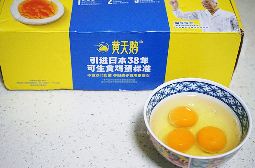 三个黄天鹅鸡蛋在碗中打成均匀蛋液。