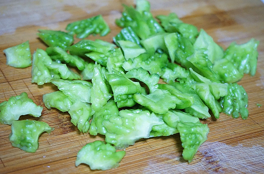 苦瓜一根,两头去梗切段,对半切开后去瓜瓤,洗净后斜刀切成苦瓜片。