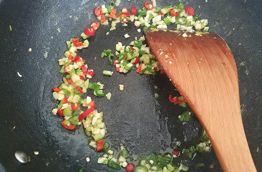另起锅,加油加热,煸香葱姜蒜、线椒和小米椒末,倒入鸡肉末同炒至变色。