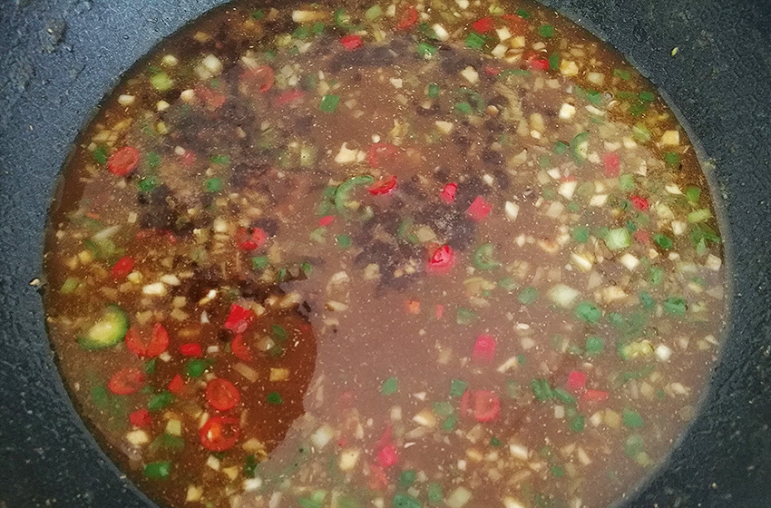 倒入用酱油、盐、糖、淀粉和水调好酱汁,烧开。