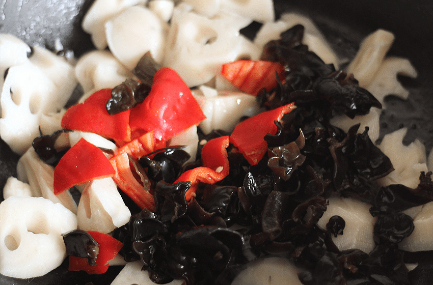 倒入莲藕片,大火继续翻炒,大约1分钟。