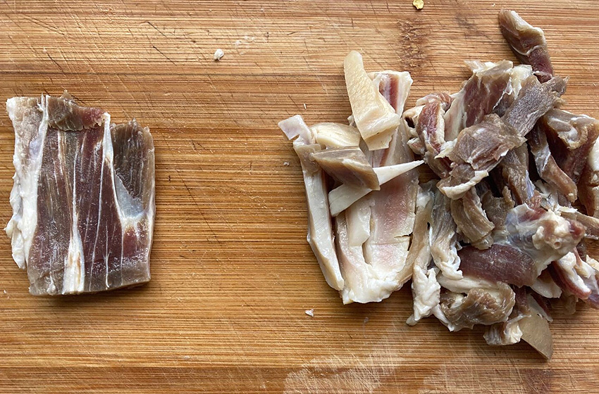 浸泡好的云腿肉清洗干净,用刀切成细条,装盘备用。