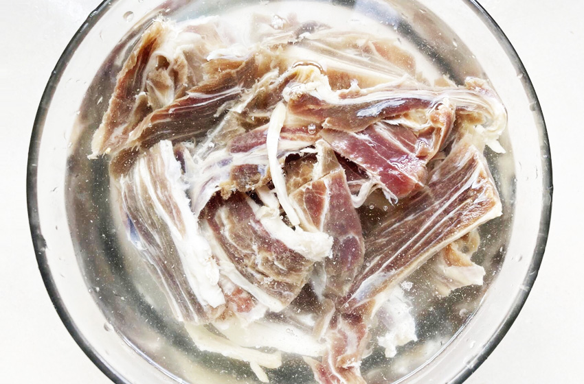 云腿肉放入碗中,清洗干净后,倒入适量的水,浸泡2-3个小时,中间每隔15-20分钟换一次水,把云腿肉里头的咸味尽量浸泡掉。