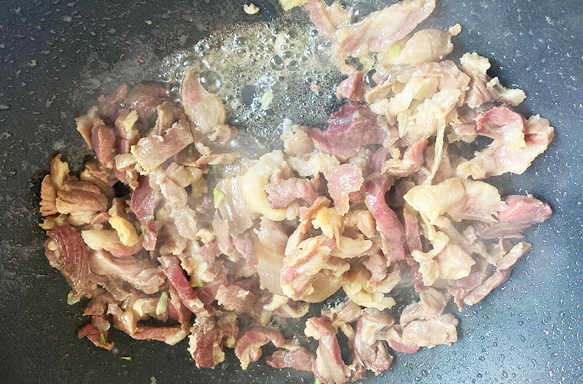 2、在炒云腿肉时把云腿肉里的油脂炒出,是为了这样炒出的云腿肉好吃,不油腻而且炒出蒜薹的口感更好吃。