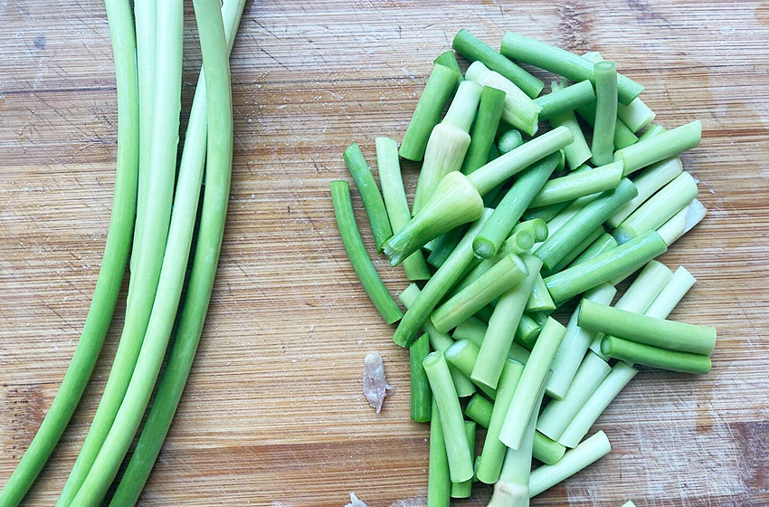 材料:蒜苔1把、云腿肉适量、生抽1匙、蚝油1匙、葱末适量