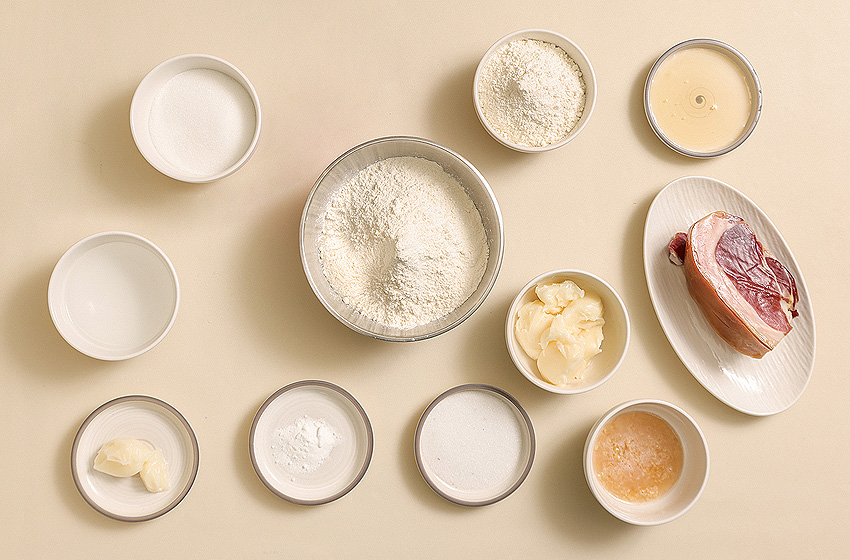 馅儿材料:云南宣威火腿550g、蜂蜜65g、白砂糖200g、中筋面粉150g、猪油20g