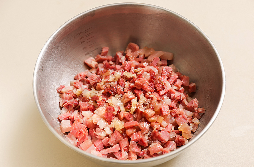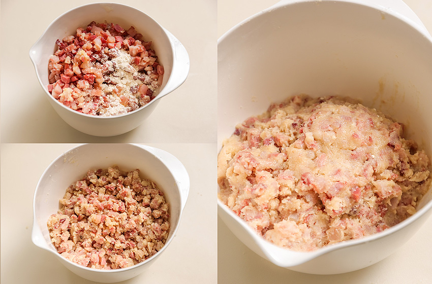 把炒熟的面粉、猪油、白砂糖、腌渍好的云腿,搅拌均匀,后期需要用手按压混合,才能抱团,馅儿料完成。