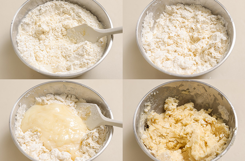 饼皮材料中所有粉类混合加水拌均匀备用。再加入猪油、蜂蜜、糖搅拌均匀。