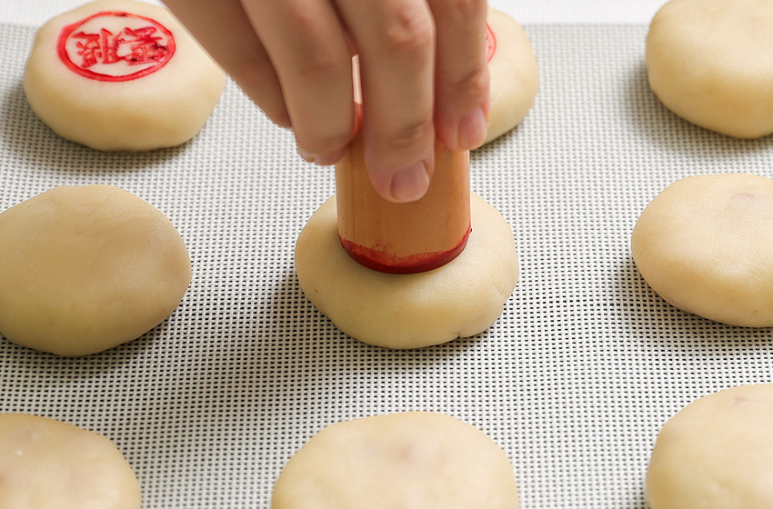 红色素+少许水调和开,用红色印章沾取,在月饼表面盖上印子。