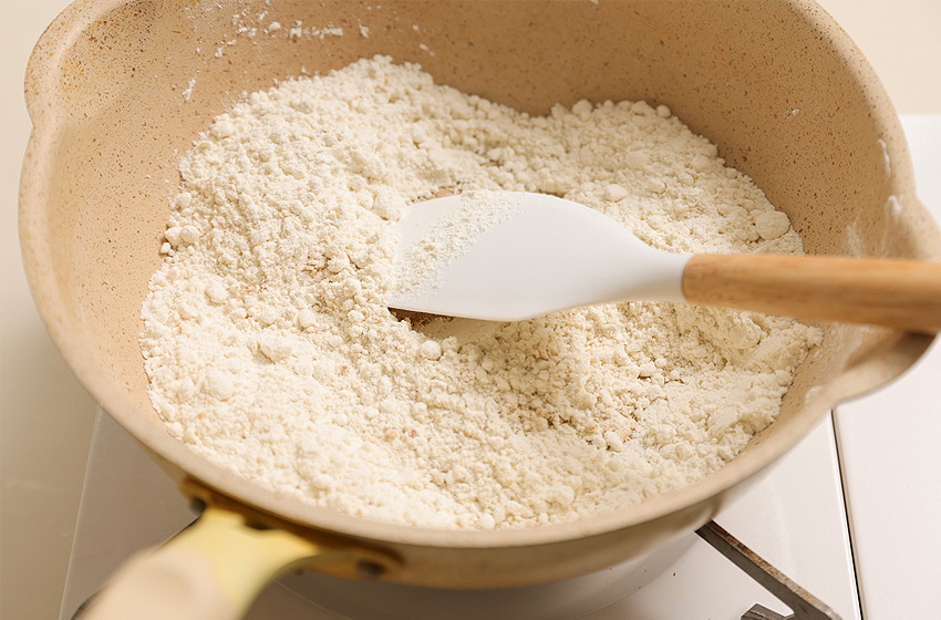 将馅料用的中筋面粉放在锅中,炒熟,微微黄色即可。