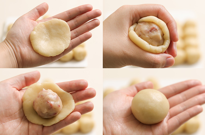 取一个皮子,压扁,压成圆皮,包入冷藏过的云腿馅儿,用虎口收口,收口向下,搓圆。