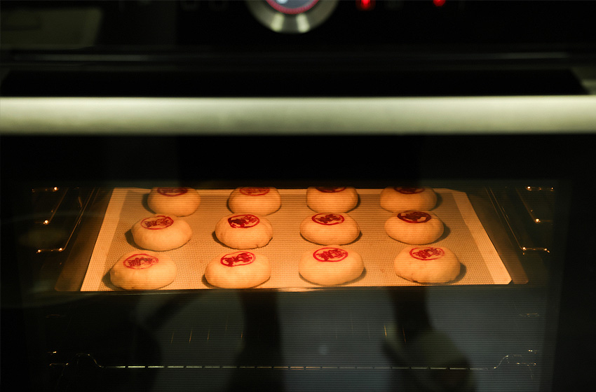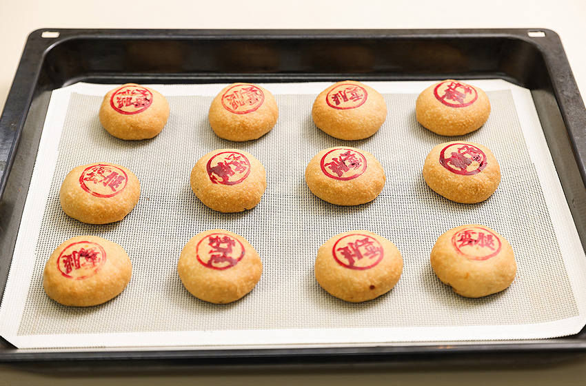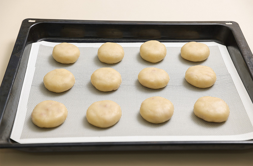 预热烤箱,190度,全部包好,放在烤盘中,压扁,每个月饼直接需要保持一些间距。