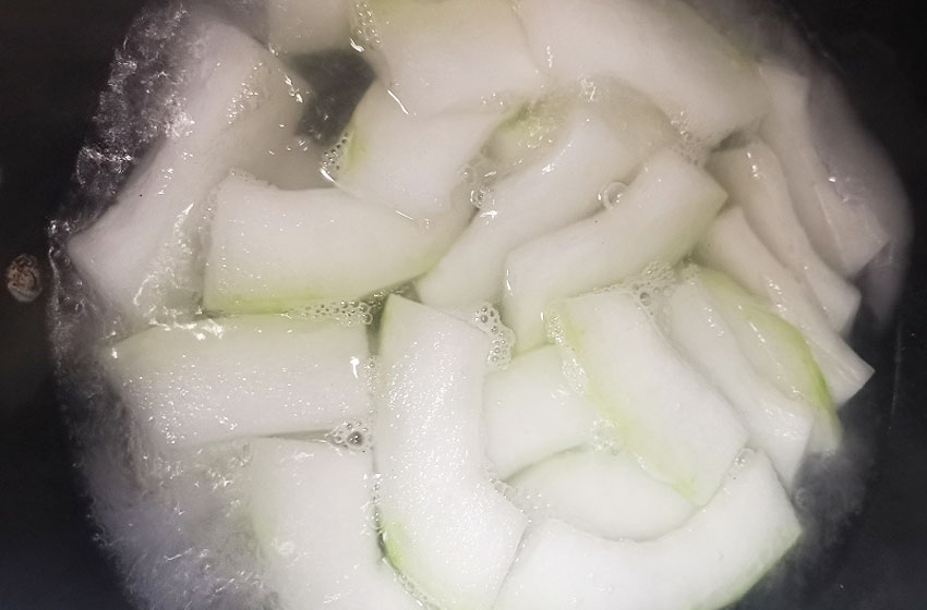 炒锅烧开水加盐,倒入冬瓜先绰水,冷水过凉沥干水分,这一步主要是好煎,容易熟,而且也不耗油。