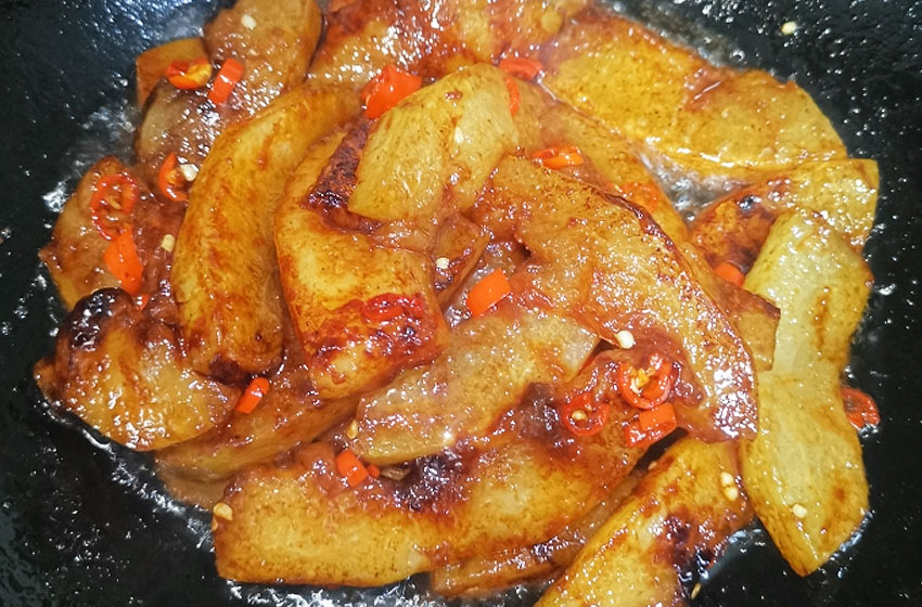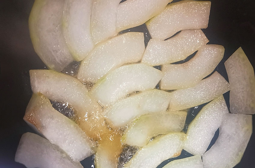 炒锅烧热放茶油,下冬瓜,均匀摆平,小火慢煎,两面煎的微黄,这一步考验耐心了,不急,茶油拌小火飘来阵阵微香。