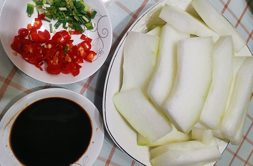 冬瓜去皮去瓤,切成大约1cm*8cm厚片,红椒香葱切细,耗油生抽老抽加少许清水调一个料汁。
