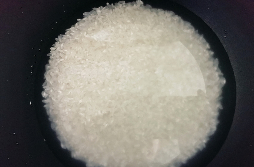 大米洗净后,直接放电饭锅浸泡一会,加水的量比要平时煮饭少一半水。
