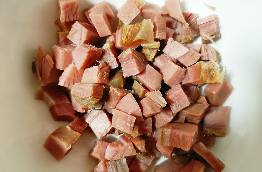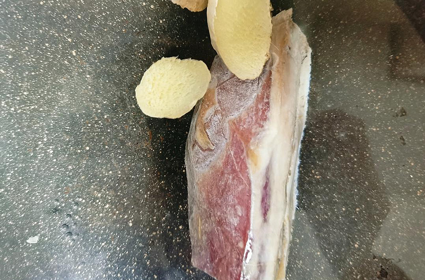 火腿肉加生姜、黄酒煮一下,去腥也去咸味。