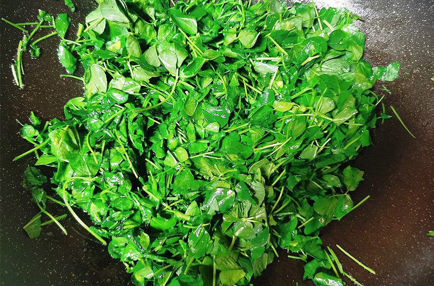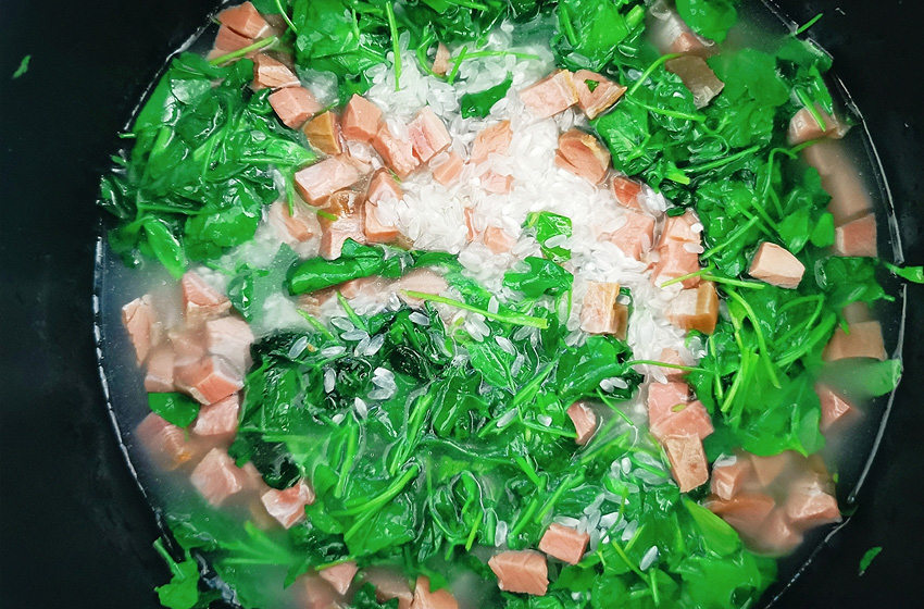 草头断生后和火腿肉粒一起放入电饭锅,正常煮饭模式。