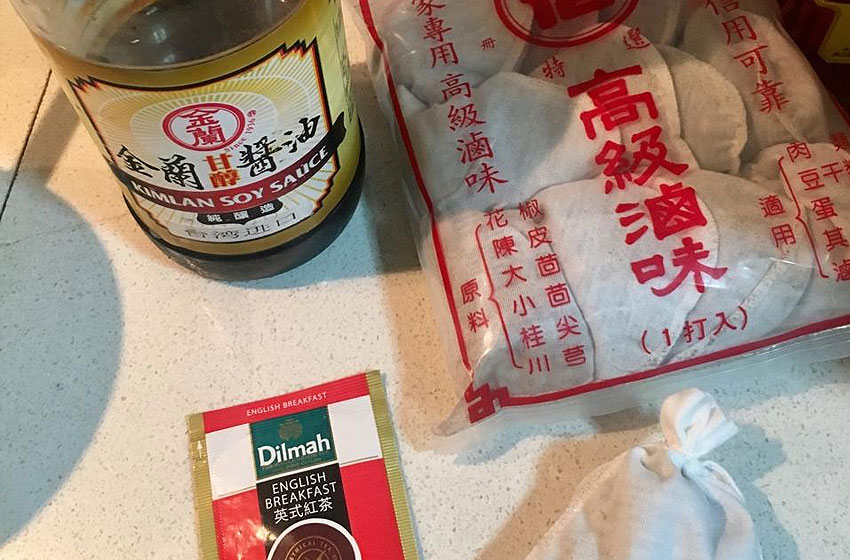 信牌卤包一包,有机红茶包一包,金兰酱油准备好。卤包和茶包冲洗一下用。