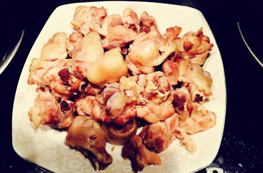 洗净切成小块,洗净焯水,冷水下锅。冷水下锅的目的是将鸡肉里的血污除去,也可以最大程度地除去鸡肉的禽腥味。焯水后捞出洗净待用。