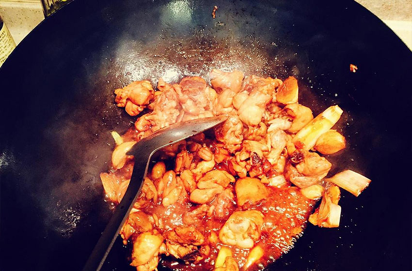 大火烧开转小火,让汤汁收干,记得要给鸡块翻身。