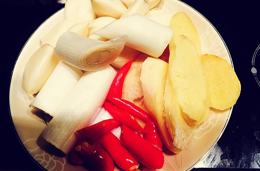 生姜切大片,量可以多一些,大概十几片左右。蒜瓣剥皮、葱切段、红尖椒切段待用。