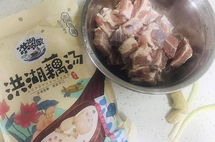 材料:排骨750g克、洪湖莲藕(也可自己买莲藕,尽量买粉藕)900g、姜4片、小葱1根、盐1小勺、鸡精1小勺