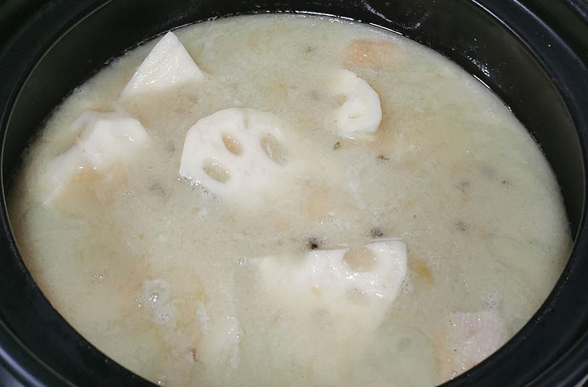 煮了二十分钟汤煮成奶白色,切入600g洪湖粉藕进去。