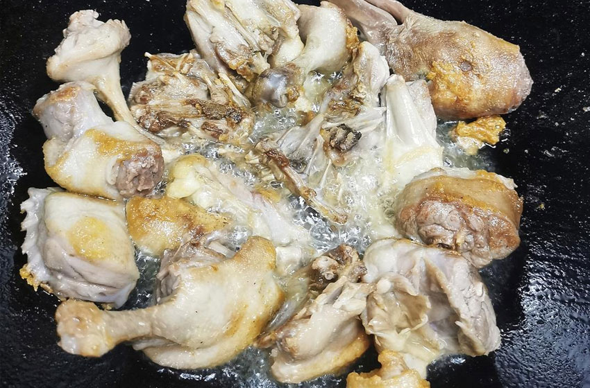 锅里放适量的油,烧热以后下入鸭块,煸炒得鸭皮焦黄。