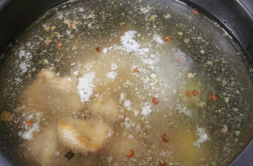 砂罐中放入足量的开水,将炒好的鸭块全部倒进去,放入适量生姜片,小火焖煮二十分钟。