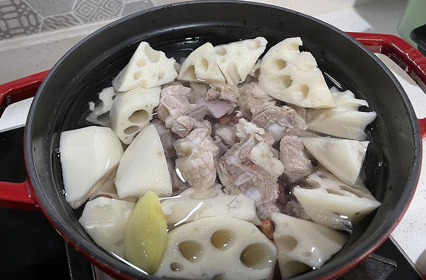 材料:排骨600克、洪湖粉藕2节、红皮花生适量、盐适量、葱姜适量、料酒适量