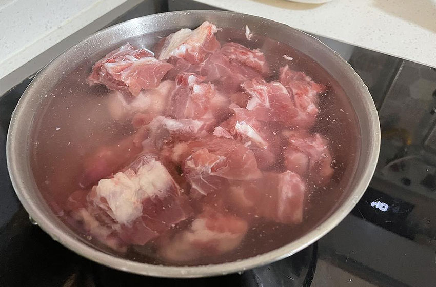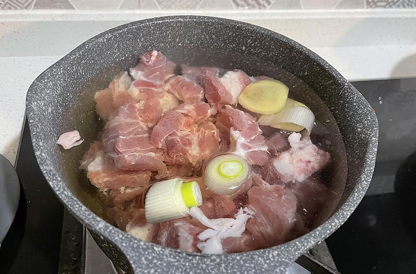 焯水:锅里下排骨,葱姜,料酒,冷水煮沸。