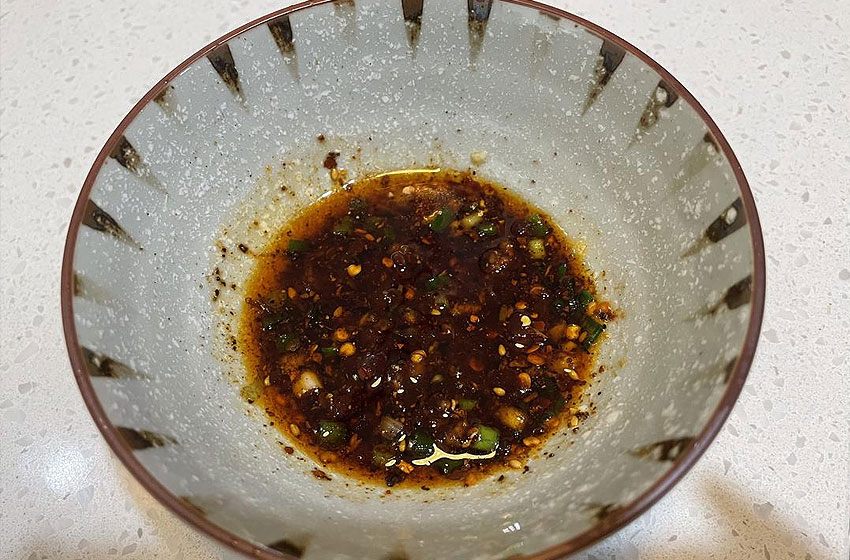 再加入红油辣椒,花椒粉,生抽,就好啦!这个调料融入了豆瓣酱的酱香和红油辣椒的酥香,一般人我不告诉他