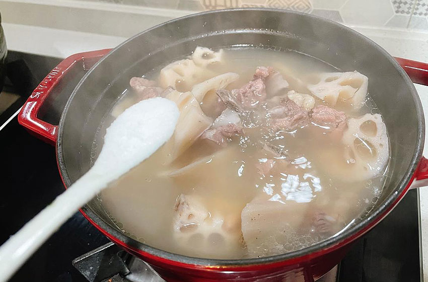 铸铁锅里放排骨,藕,洗过的花生,加两片姜,加开水没过食材,大火煮开后小火慢炖。不用放其他调料了,焯水的时候放过葱和料酒了。我不想别的味道盖住食材本身的味道~