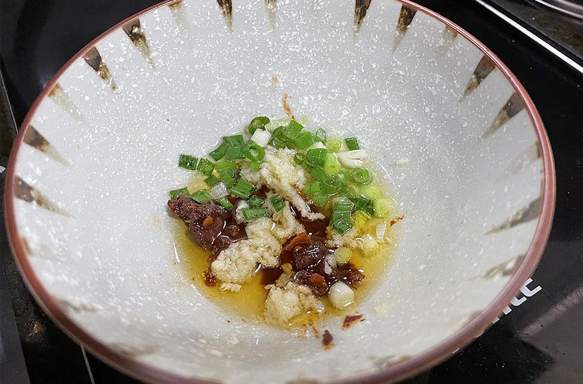 调料:今天做一个很香的调料,用来蘸排骨和莲藕。碗里放豆瓣酱,葱花,蒜末,浇热油烫熟。