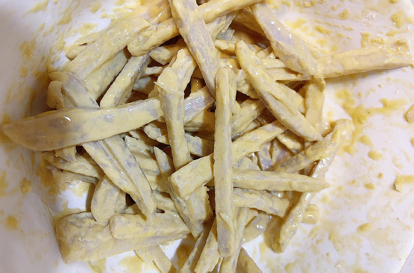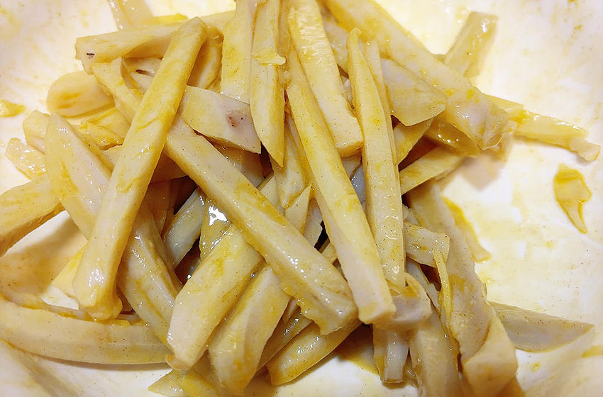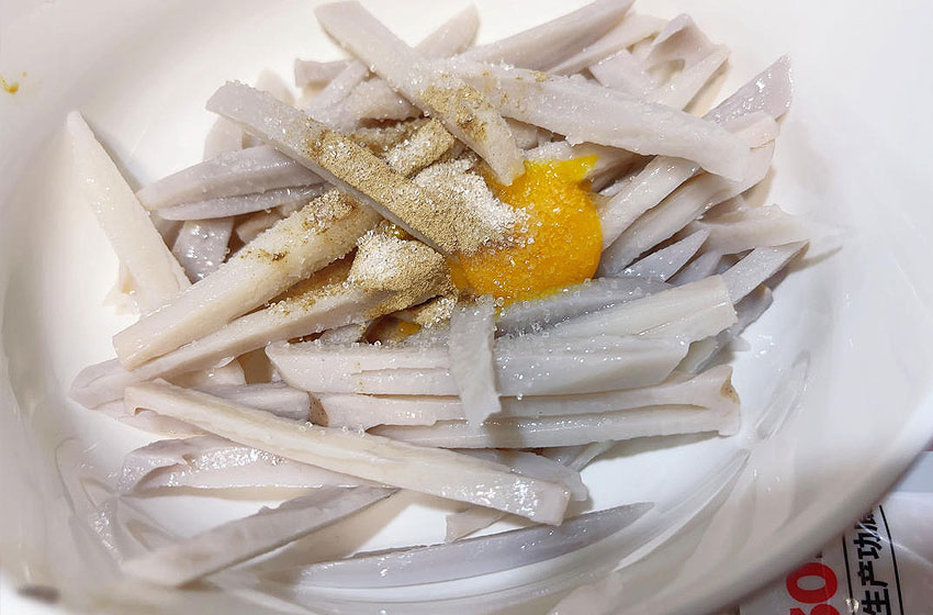 在控干水分的藕条中加入一个蛋黄,3g糖,1g五香粉和3g盐。